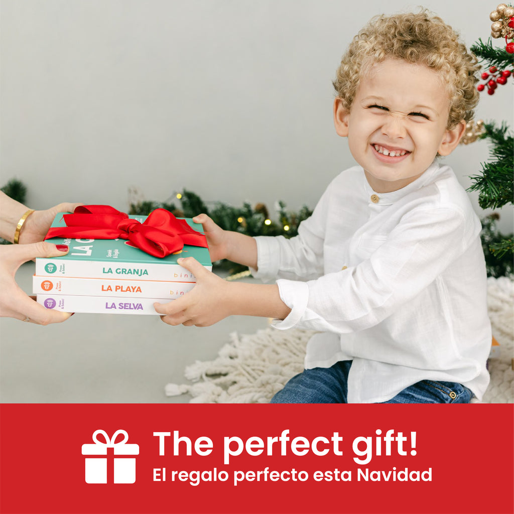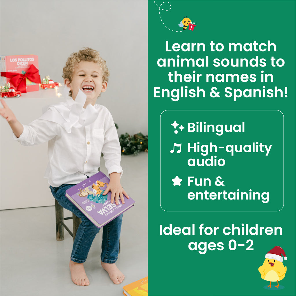 Created by bilingual moms and approved by childhood development experts, this jungle adventure helps kids connect animal sounds with movement words, encouraging vocabulary growth in both languages. Whether you’re building a collection of Spanish books for toddlers, looking for an interactive way to introduce Spanish to your baby, or adding to your shelf of favorite bilingual books for kids, this hands-on sound experience brings language to life in a way that feels natural, joyful, and memorable.