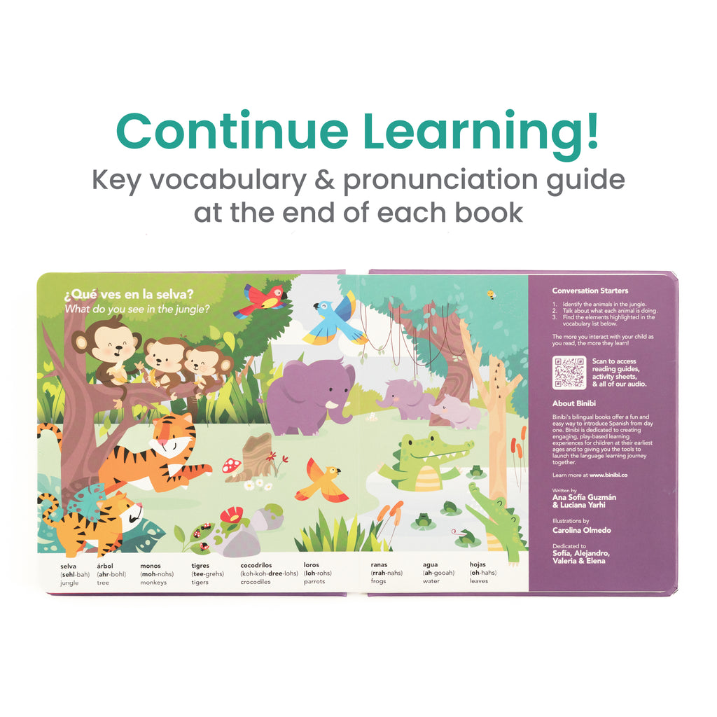 La Selva is part of our growing collection of bilingual children’s books designed to introduce Spanish through sound, play, and real-life concepts. Perfect for helping little ones learn animal names, action verbs, and essential vocabulary as they begin their bilingual journey.