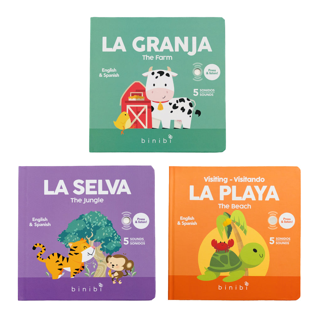 Save 10% with our Bilingual Sound Book Bundle—three interactive board books that bring Spanish learning to life with real-world sounds, colorful visuals, and playful exploration. Designed for babies and toddlers, this collection offers an exciting journey through the farm, the beach, and the jungle—making early language learning engaging and fun.
