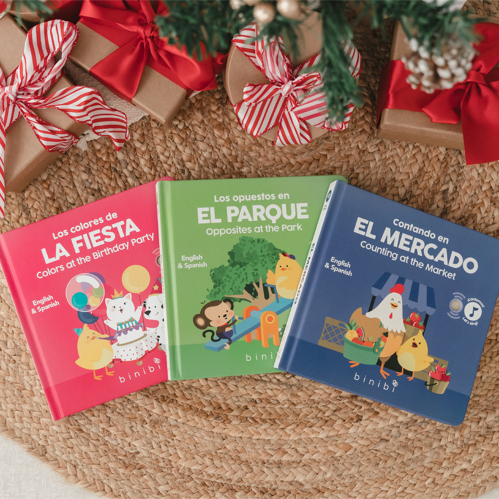 Save 10% with our bilingual Early Concepts Bundle—three interactive musical books that teach Spanish through catchy songs, everyday adventures, and playful repetition. Designed to introduce little ones to early educational themes, this vibrant set helps children learn colors, numbers, and opposite words in Spanish, all through music and engaging real-life scenes.